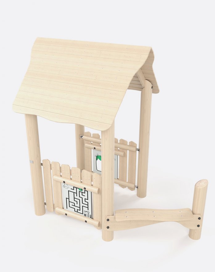 Представляет собой сквозной домик с крышей, небольшими перегородками, интерактивными панелями и скамейкой.