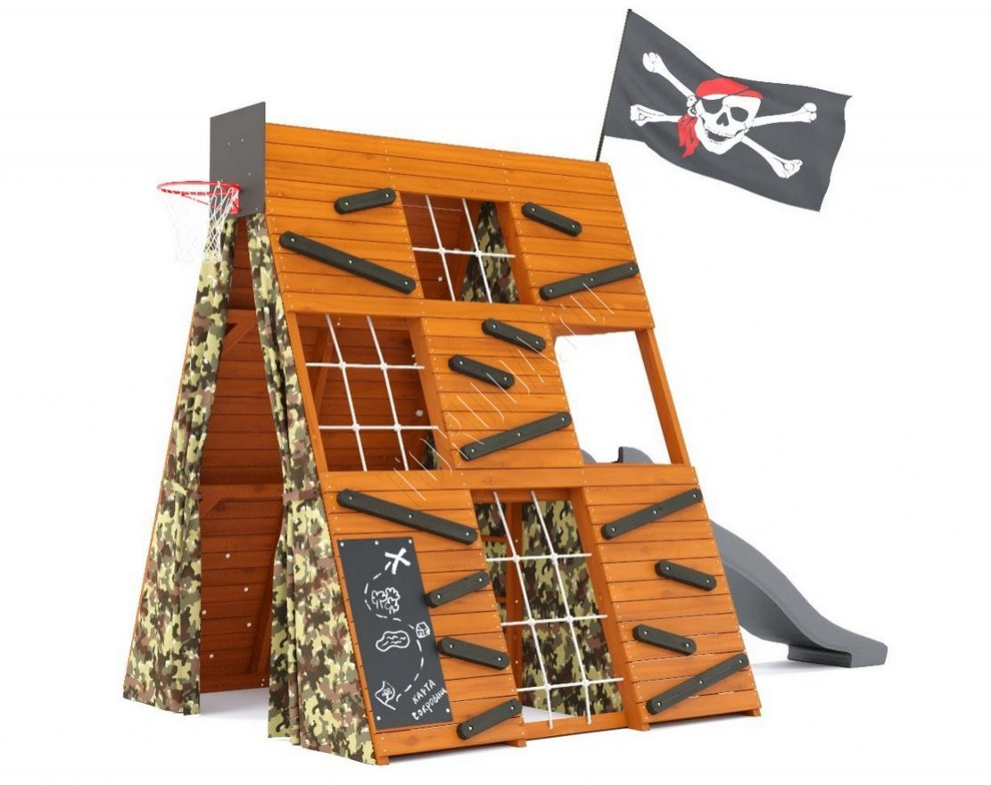 В домике есть всё, чтобы создать собственный мир игры и приключений: многосекционный скалодром с пластиковыми и деревянными зацепами, гладиаторские разноуровневые сетки, меловая доска для рисования и творчества, бинокль и даже баскетбольное кольцо со щитом. Внутренний лаз с выходом на платформу и внутренняя лестница - это ещё больше возможностей для детского творчества и активного отдыха.