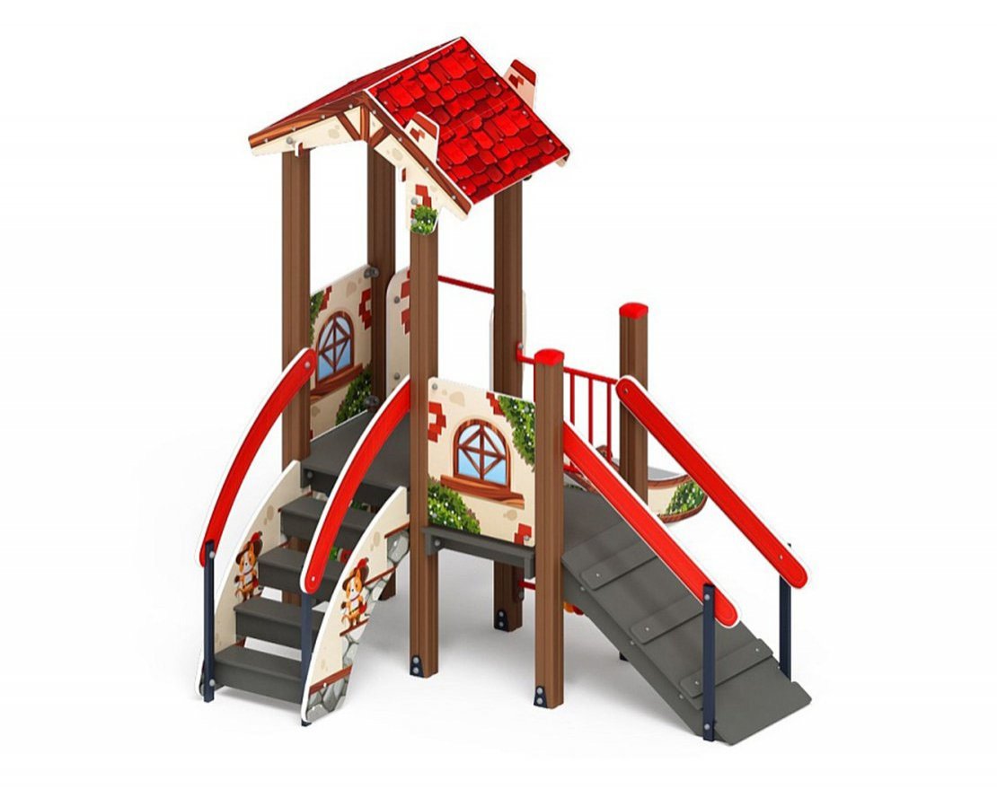 Спаренные башни из шести клеёных брусьев 100х100мм высота 2500мм (4 шт) и 1500мм (2 шт); полы из ламинированной фанеры, с анти-скользящим покрытием 780х780мм толщиной 18мм (2 шт). Одна часть башни украшена двускатной крышей из влагостойкой фанеры - арки из фанеры толщиной 18 мм, скаты крыши фанера толщиной 12 мм. Кромки фанеры тщательно отшлифованы, фанера окрашена с нанесением принта. Башня двухуровневая - от планировочной отметки площадки 900 мм и 750 мм соответственно. Габарит башни 780х1460х2790мм
