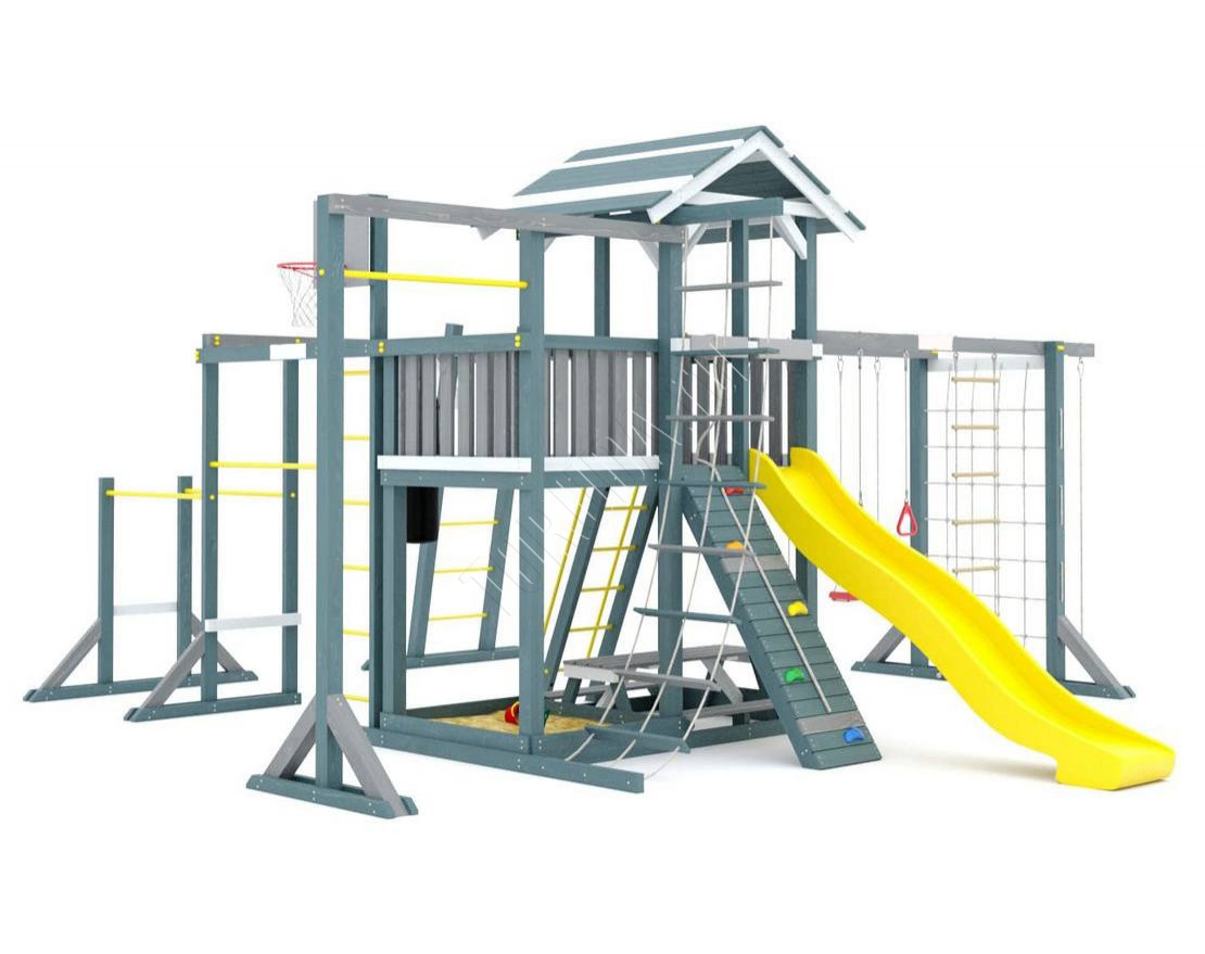 - Комплекс состоит из отдельных блоков, соединённых с башней, находящейся в центре. Вскарабкавшись на неё по скалодрому или лестнице, ребёнок может съехать вниз с горки. Там для малыша мы подготовили уютную песочницу, а также детский игровой столик. Качели типа "лодочка", расположенные рядом, выдержат ребят разного возраста и массы.