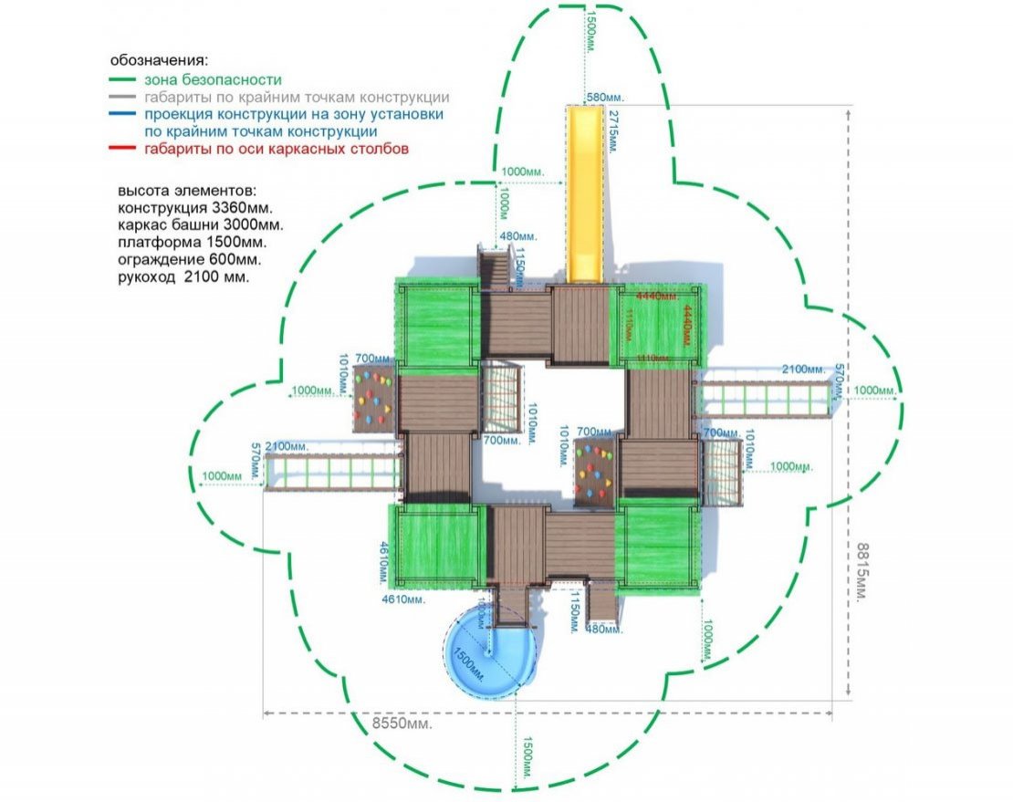 Для безопасной эксплуатации конструкции, площадка должна быть свободна от зеленых насаждений, сооружений и других конструкций, ровная, без перепадов уровня, без впадин и насыпей. Габариты площадки с учетом зоны безопасности длина 12075мм. ширина 11750мм., площадь площадки S-142м². Запрещено устанавливать конструкцию в зонах с повышенным риском провалов в грунте (болотистая местность, береговая линия водоемов, в непосредственной близости с оврагами и обрывами).