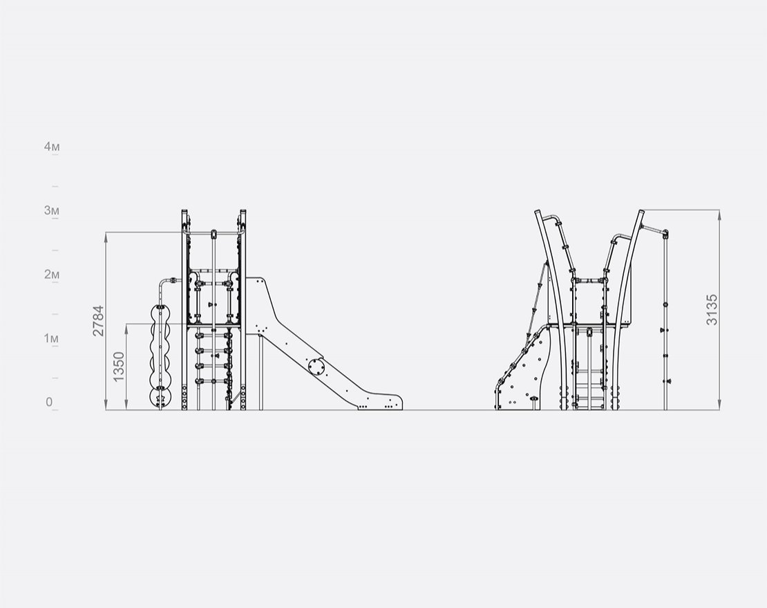 Состоит из металлической горки с пластиковыми защитными бортиками, канатной стропы, лестницы и металлических труб для лазания. Конструкция оснащена пластиковыми уступами, ручками и скалодромными зацепами.