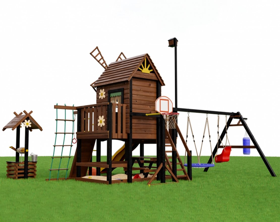 Игровой комплекс Мулен 2 с колодцем — это уютный деревянный домик, наполненный атмосферой приключений. Его узнаваемый силуэт с декоративными лопастями на крыше перенесет детей в мир сказок, где можно представить себя отважным путешественником, хозяином мельницы или капитаном воздушного корабля. Площадка сочетает различные игровые и спортивные элементы, помогая ребенку развивать ловкость, силу и координацию. Лестницы, канаты, качели и горка превращают игру в увлекательное приключение, в котором важно не только фантазировать, но и двигаться. Внутри домика продумано всё до мелочей — каждый уголок наполнен возможностями для игры, творчества и удобства. На втором этаже маленьких художников ждет доска для рисования, где можно воплощать свои фантазии. Два отдельных столика со стульчиками позволяют детям играть, рисовать или устраивать чаепитие, не мешая друг другу. А просторная песочница под домиком станет местом для совместных экспериментов с песочными замками — здесь хватит места всем! Два раздельных входа делают пространство более просторным и удобным, создавая еще больше возможностей для веселой и динамичной игры.