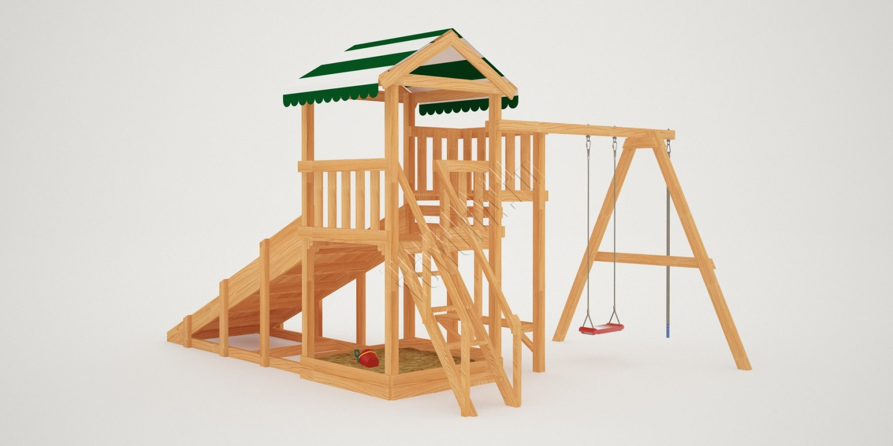 Всесезонная модель Гарда 1 обладает натуральным цветом дерева без покрытия и модульной конструкцией. Одновременно на площадке могут играть несколько детей. Основа конструкции – игровая башня с балкончиком и яркой пластиковой горкой.