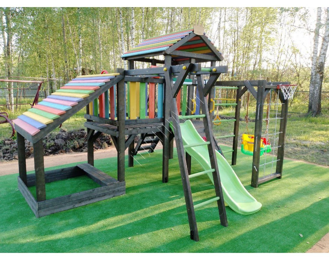 - Обработка дерева: лакокрасочным покрытием с разрешающим сертификатом для покрытия детских игровых площадок