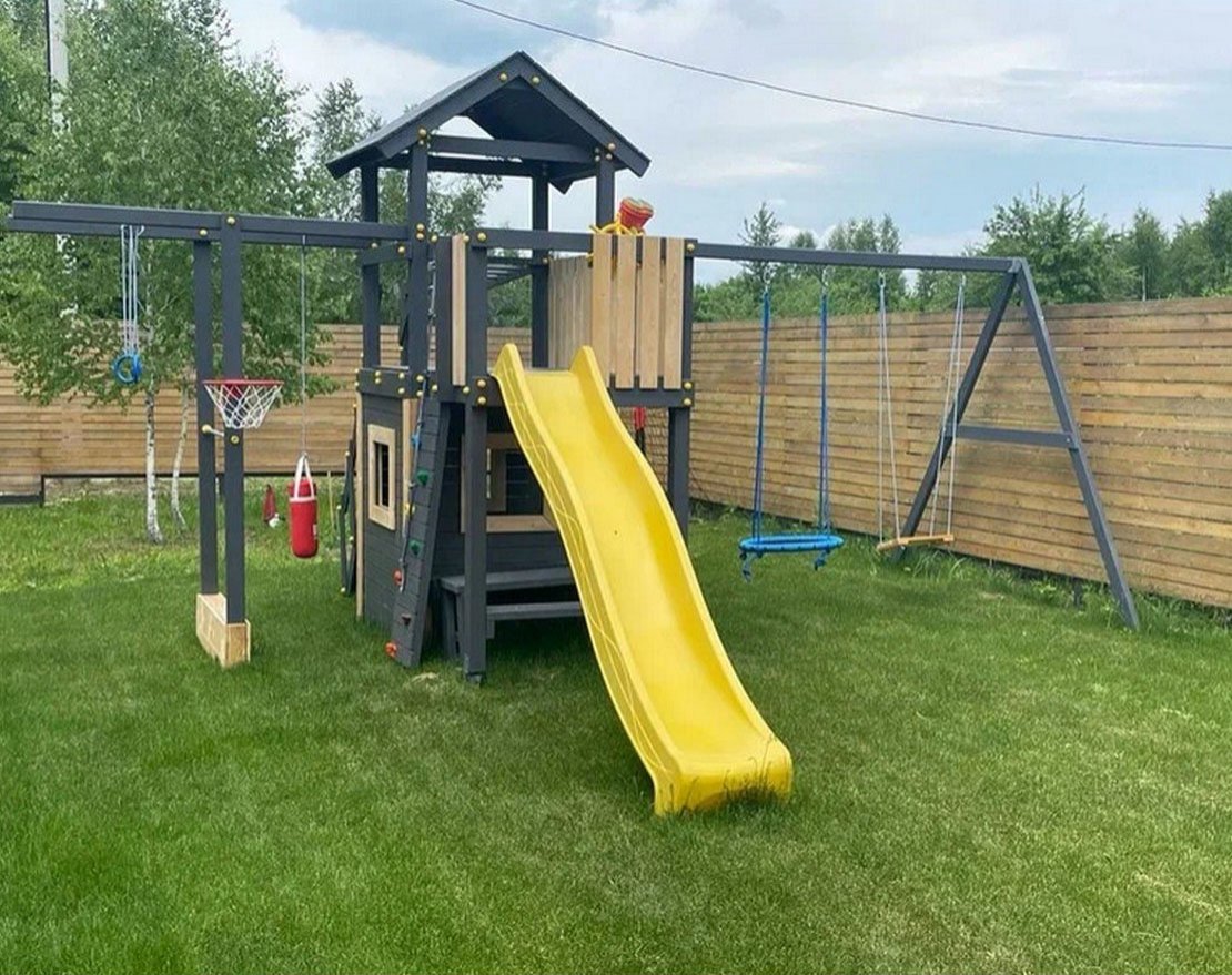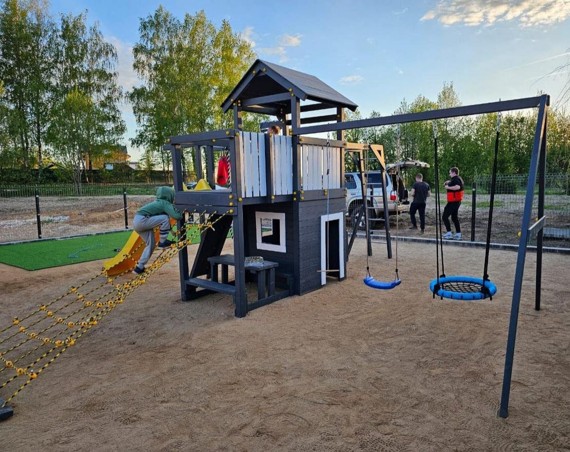 Максимально возможная комплектация в сочетании с турником, скамейками со столиком, домиком с окошками (теремок), в комплекте большая паутинка и пиратская лестница. Детская площадка в полной комплектации позволит вашим детям разнообразить свои игры на свежем воздухе, а так же пригласить своих друзей для веселого времяпрепровождения. Места хватит всем!