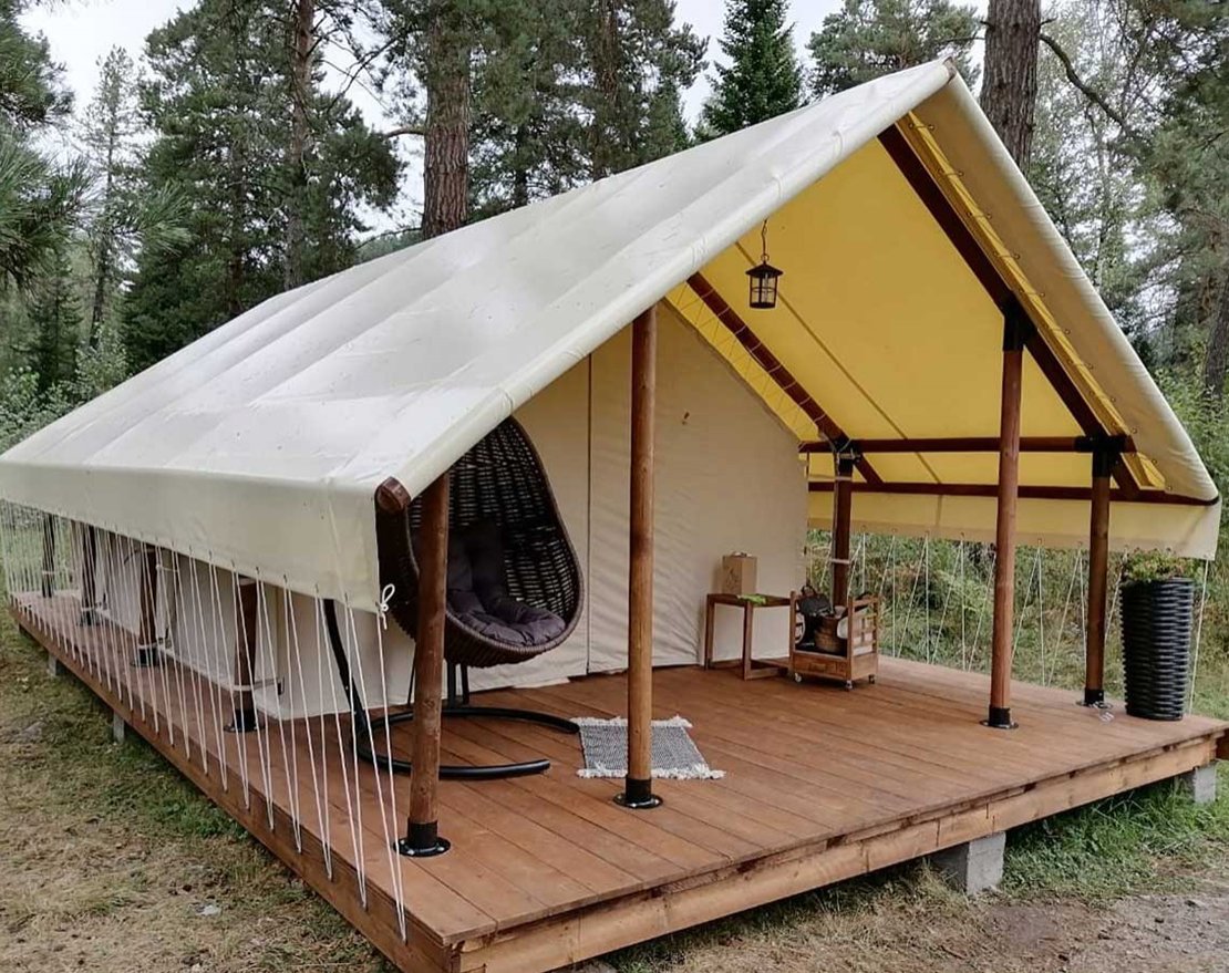 Сафари-тент — это комфортная палатка для глэмпинга, вмещающая от 1–2 до 4–6 человек. Представляет собой конструкцию на основе деревянного или металлического каркаса с двускатным навесом из ткани ПВХ и палаткой из износостойкой ткани Оксфорд, покрытие выдерживает температуру от -50°С до +70°С.