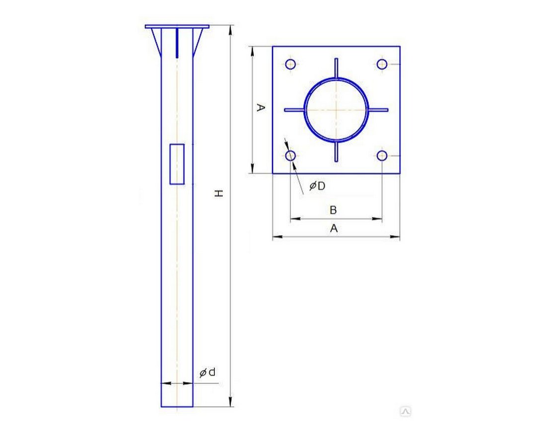 Фундамент металлический служит для передачи нагрузок от установленной опоры на фундаментный блок, выполненный из бетона. Исполняется с круглыми или квадратными фланцами. Фундамент металлический имеет сквозные окна, для прохождения кабеля в тело опоры. В фундаментной части на глубине до 500мм от уровня земли имеется монтажное сквозное окно, для прохождения силового кабеля к опоре. По желанию заказчика, глубина расположения люка от земли, может быть изготовлена по индивидуальным размерам.